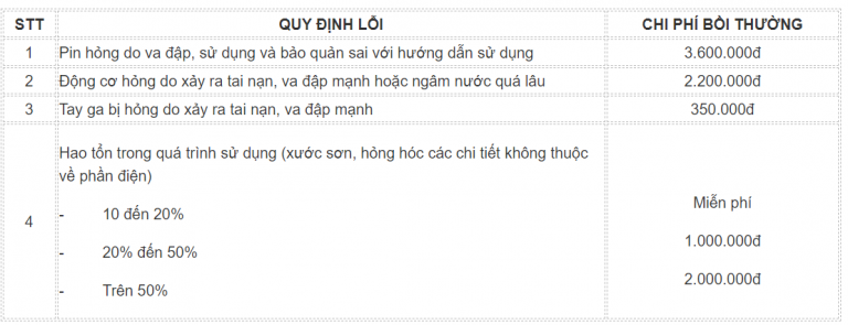 - Các lỗi phát sinh trong quá trình sử dụng không do lỗi nhà sản xuất, Người thuê xe sẽ tự chi trả các chi phí sửa chữa phát sinh.