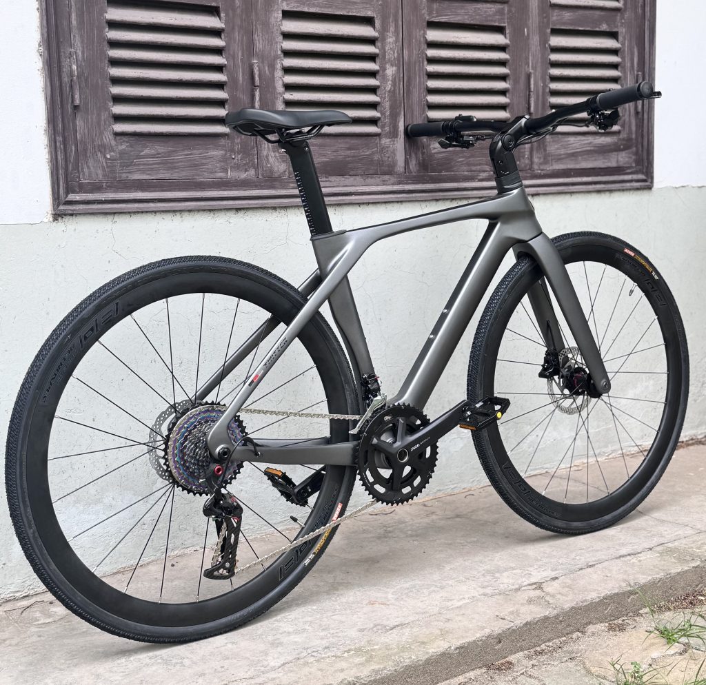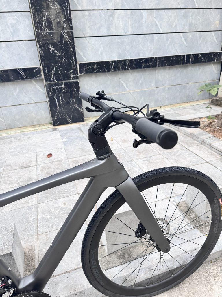 Twitter T10 Pro Touring được trang bị khung sườn Carbon fiber siêu nhẹ, giúp giảm trọng lượng tổng thể của xe xuống chỉ khoảng 8.5 kg. Khung carbon không chỉ bền bỉ mà còn mang lại cảm giác đạp xe mượt mà và hiệu quả hơn, giúp bạn dễ dàng vượt qua những chặng đường dài.